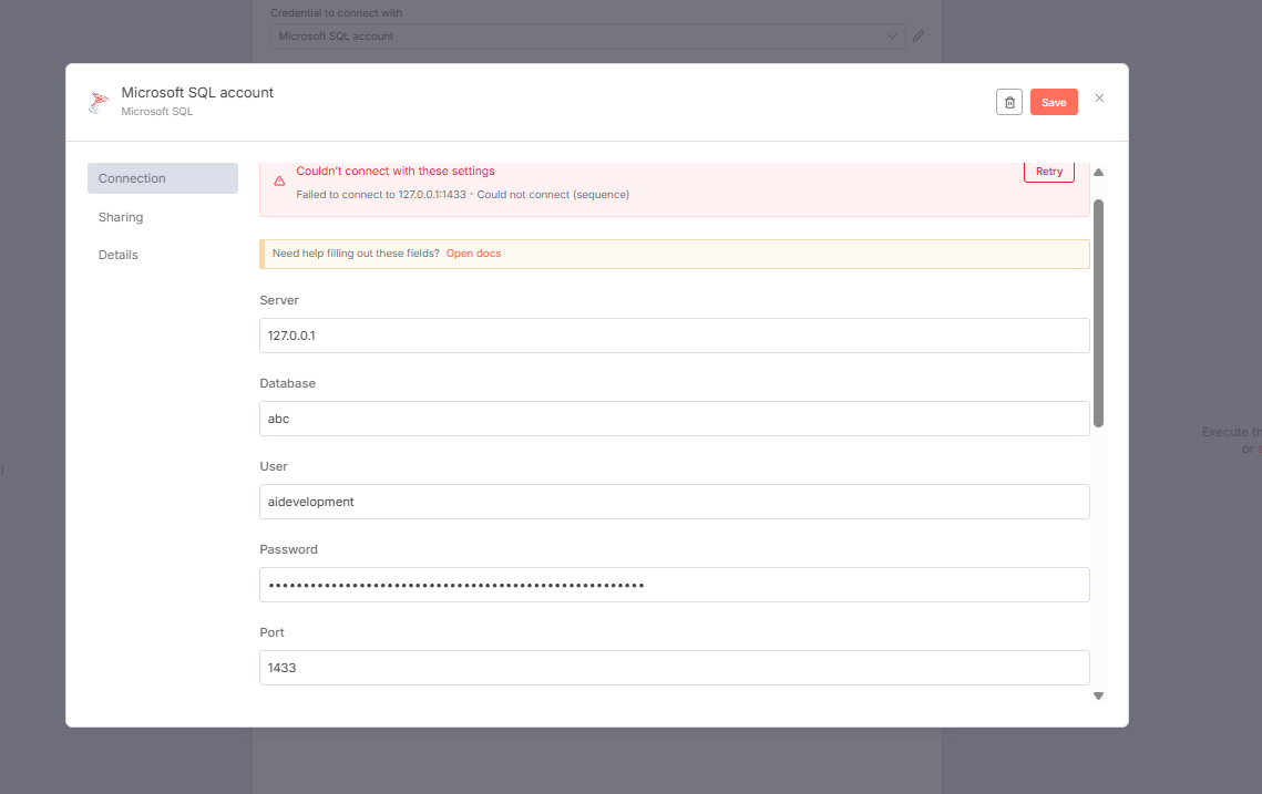 I’m trying to use the Microsoft SQL node in n8n, but the connection fails.