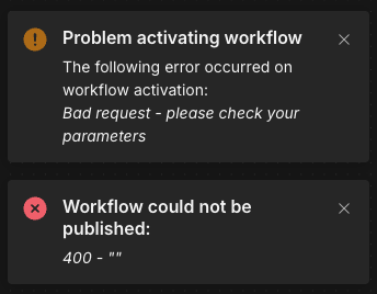There’s no visible errors on nodes, the workflow was tested through and through with mock data and I’ve gotten this error only now when I tried to publish the workflow
