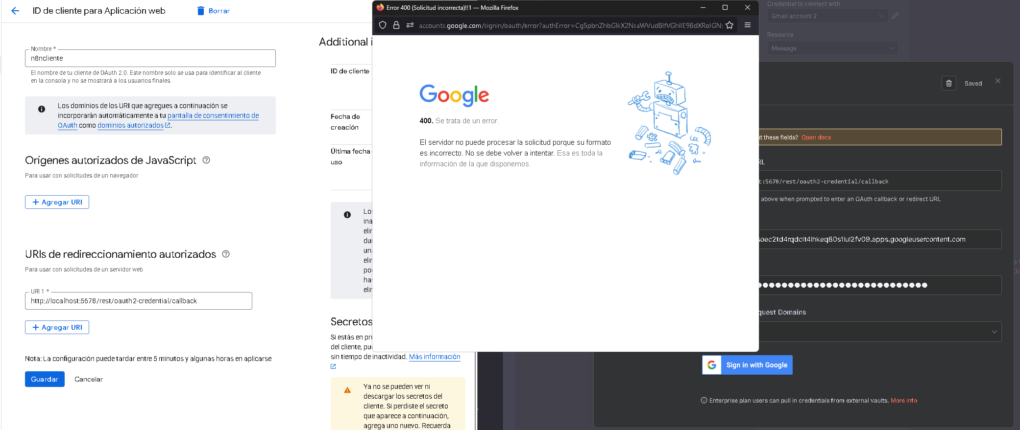 I’m trying to connect my Google account in n8n self hosted, but I keep getting a ‘‘400 error’’