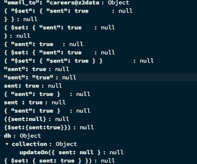 It’s not updating the existing field, but it is inserting new fields and storing the value as null (eg, “sent: true“ : null)