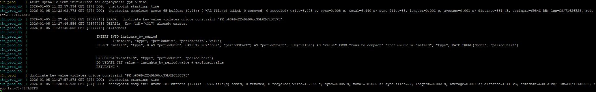 Your SQLite → Postgres migration left duplicate records in the insights_by_period table. n8n is trying to insert new stats but hitting conflicts with old data.