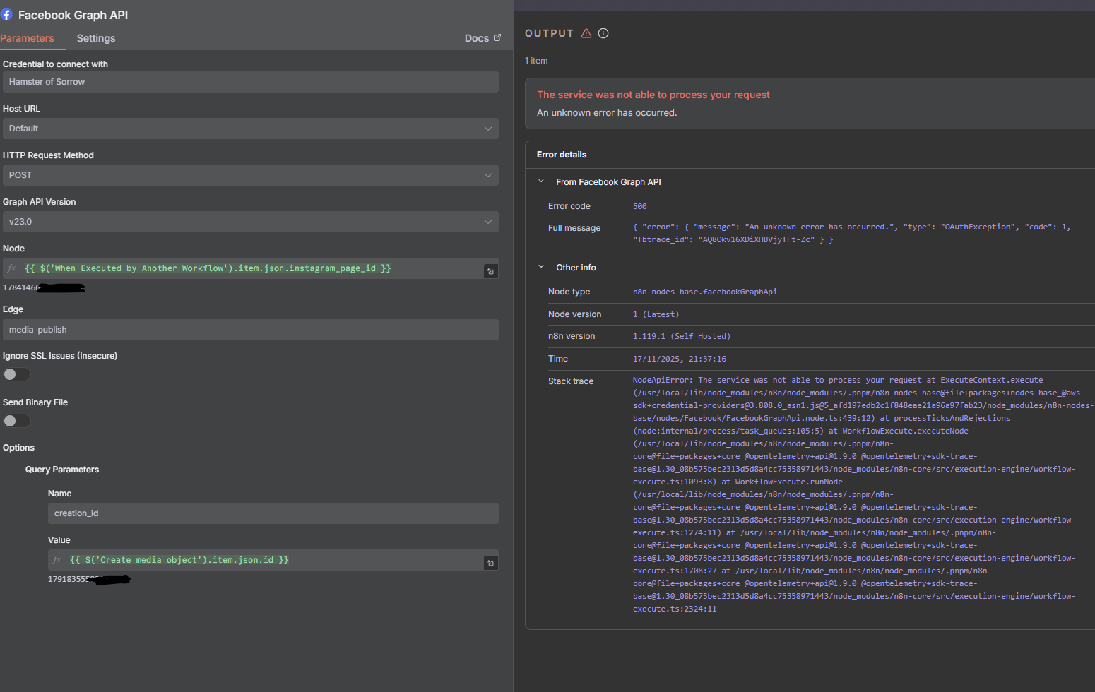 I have some issues with the Facebook API.I want to post a video on Instagram. Creating the container works every time, then I check for the status and as soon as it is finished, I want to publish the media. But this step always fails. I checked the Token, permissions and tested it with the Graph API explorer. It works there. I also tried a Http Request node. But whatever I do, I always get the an unknown error message.