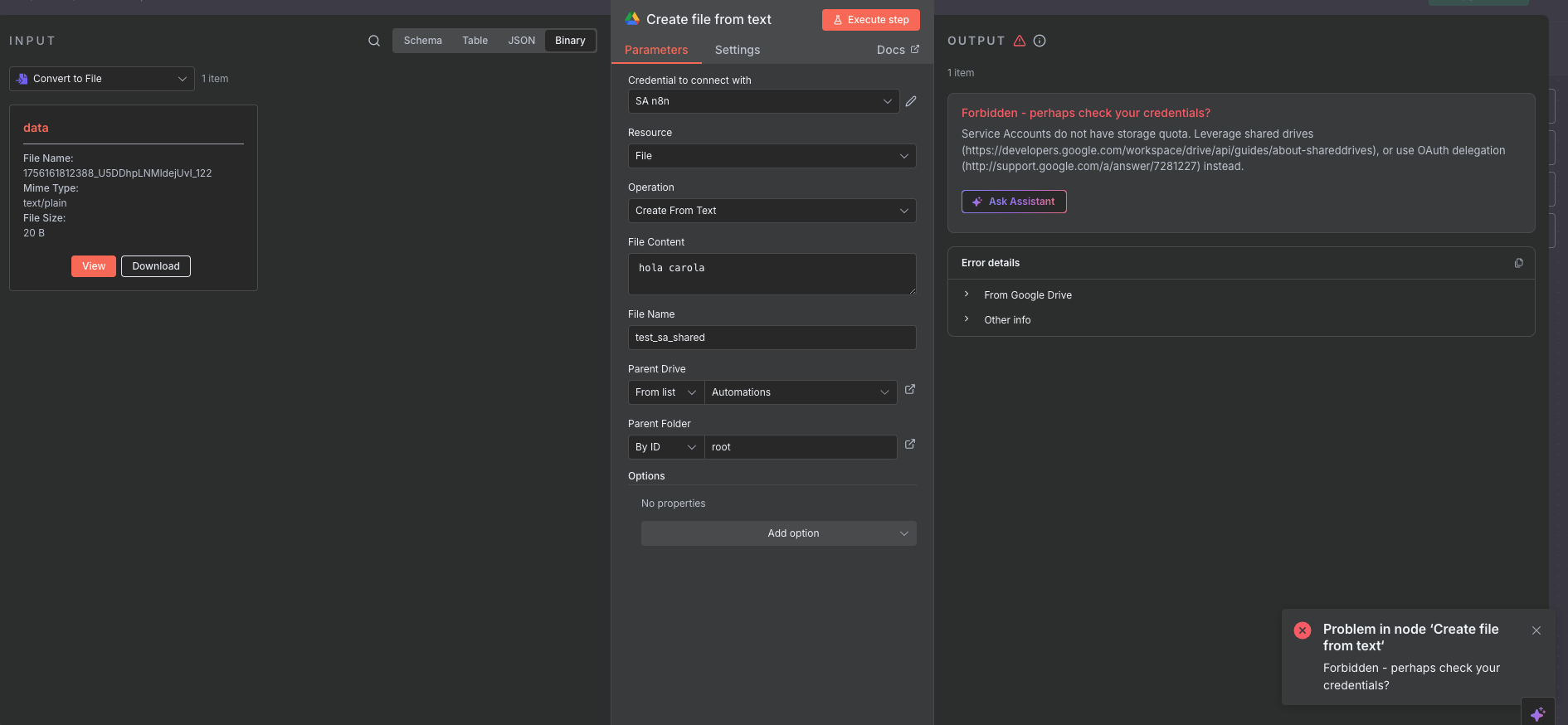 I’m not managing to use “Upload File” Google Drive node with Service Account.
