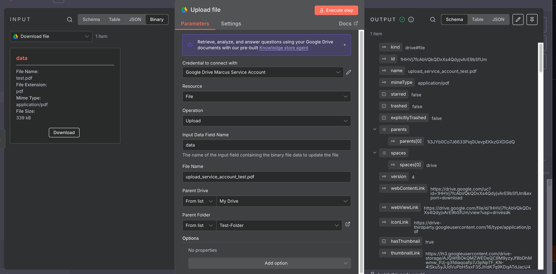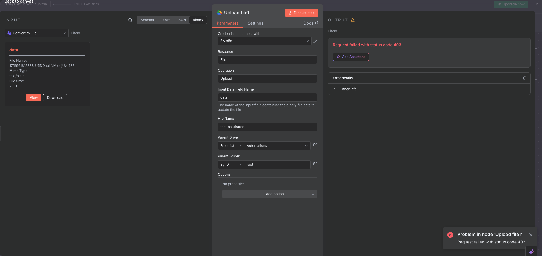 Something is definetly wrong with the Google Drive Upload File node using a Service Account