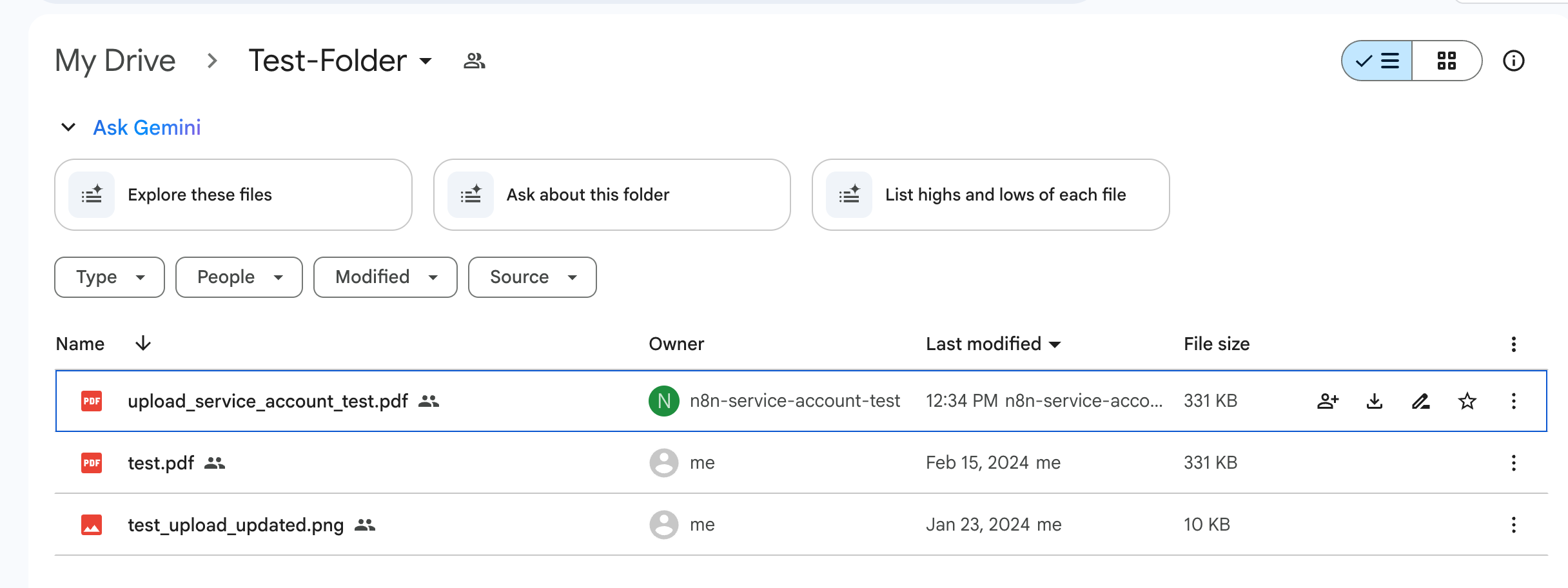 You can test it yourself using an HTTP Request node using your service account credential (with http node usage option enabled). For scopes in the service account credential you can use: https://www.googleapis.com/auth/drive, https://www.googleapis.com/auth/drive.appdata, https://www.googleapis.com/auth/drive.photos.readonly