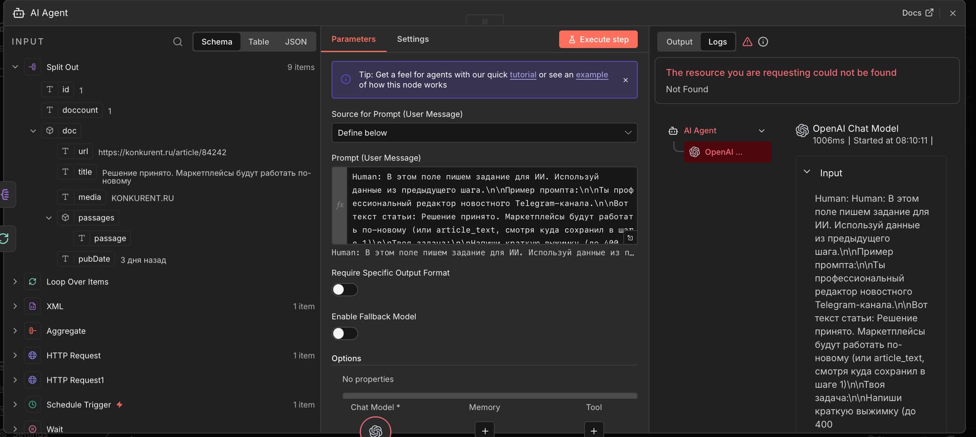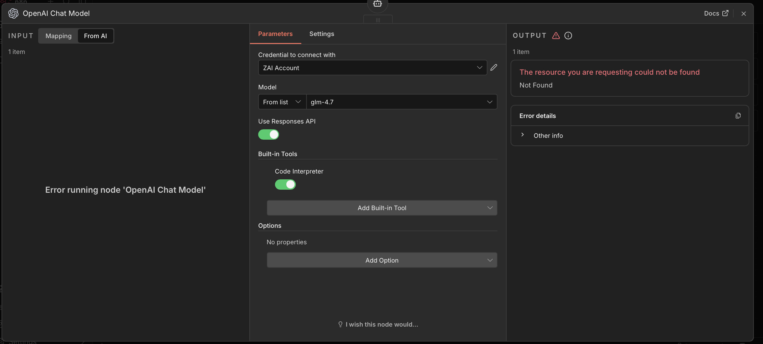 I am try use GLM in Ai Agent node, but have error The resource you are requesting could not be found