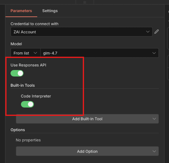 Create OpenAI credentials and change the Base URL to the GLM endpoint. Disable “Use Responses API” if the provider only supports /v1/chat/completions. Double-check that the model name matches exactly what’s in GLM’s documentation.