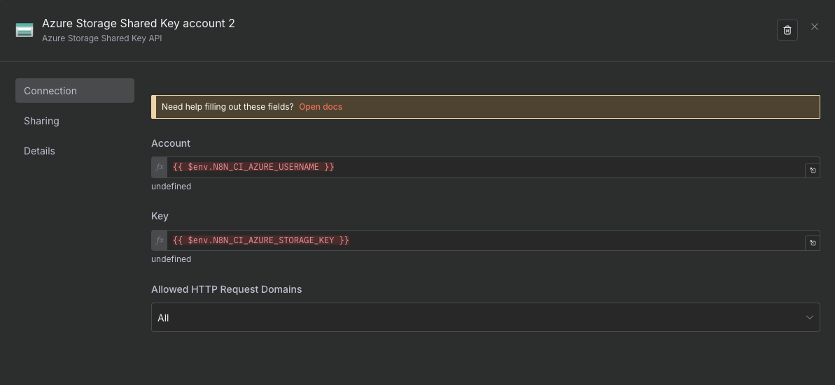 Then in n8n, within the Azure Storage Shared Key API credential, I’m referencing them like this: