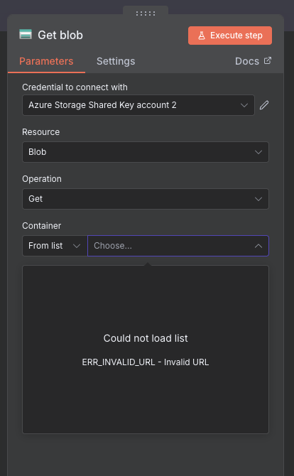 However, when I try to select a container in the Azure > Get Blob node, I get this error: