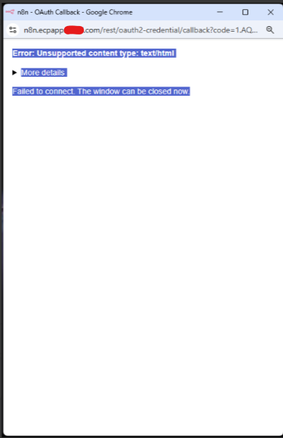I have selected Microsoft Excel 365 in the n8n and tried creating the credentials. I get the ‘Error: Unsupported content type: text/html’. I am blocked from using this node in the n8n. Please view the attached screenshot and let me know how to resolve this issue. Appreciate your help on this.