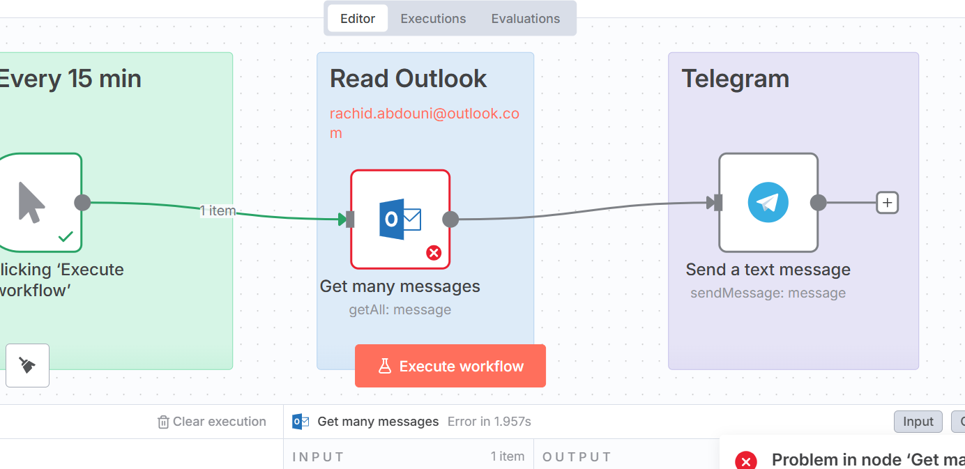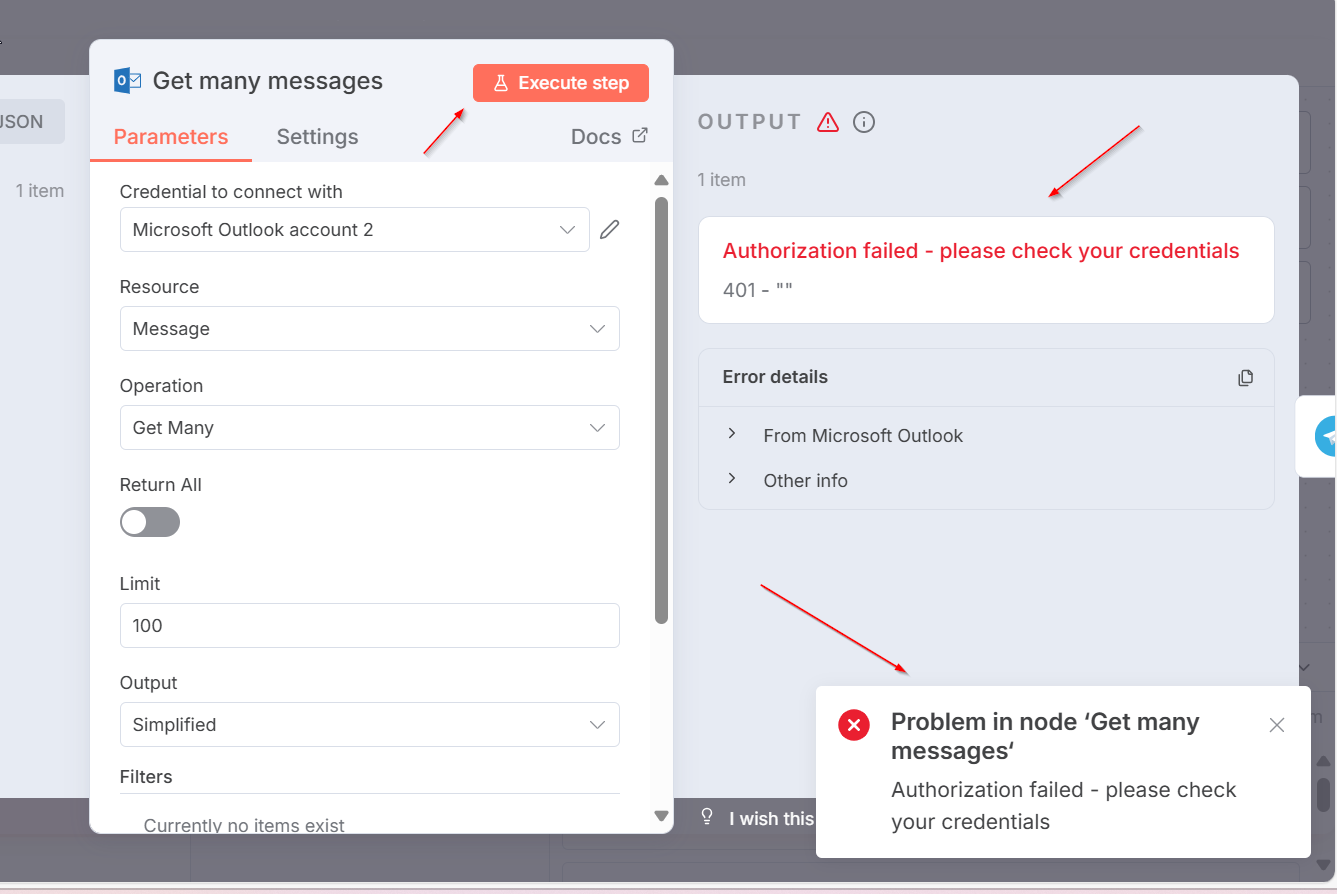 - When using Get Many messages and click “Execute Step” Button, message 401 is print out(Authorization failed - please check your credentials).