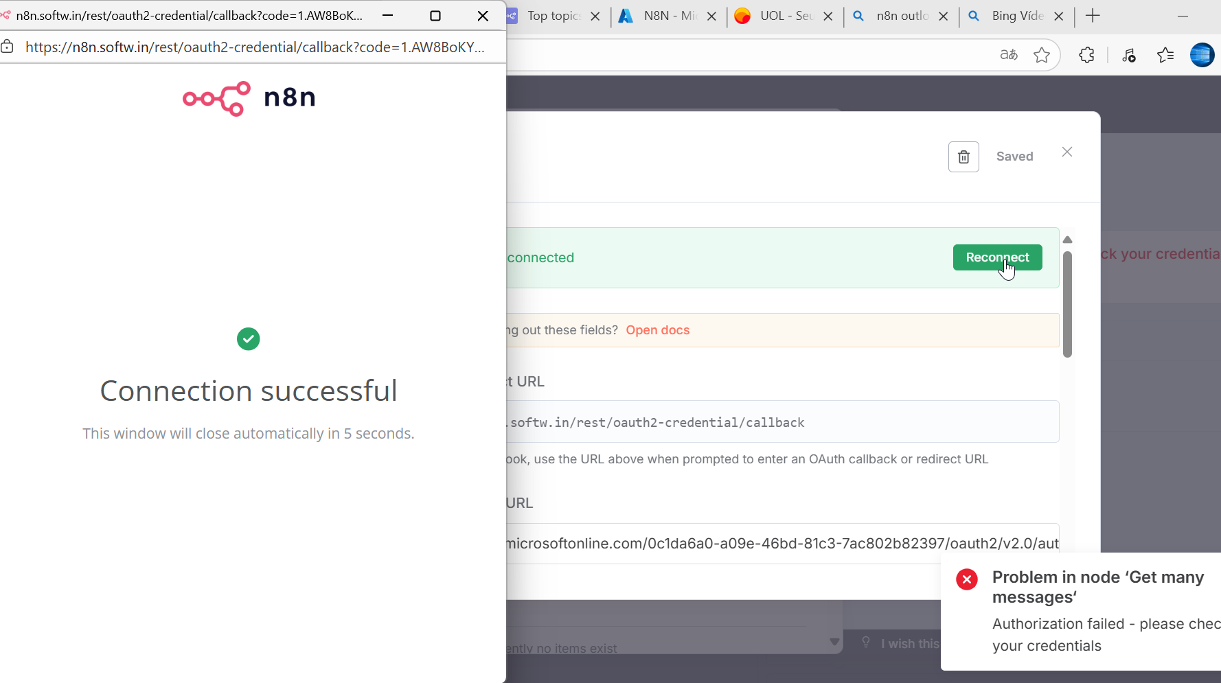 - Azure Permissions and OAUTH redirect URI are set accordingly.