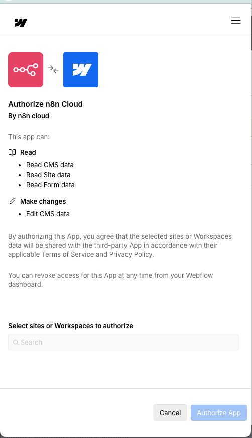 Step 2: The Webflow authorization page opens and shows the n8n cloud app BUT without any of the listed sites, etc.