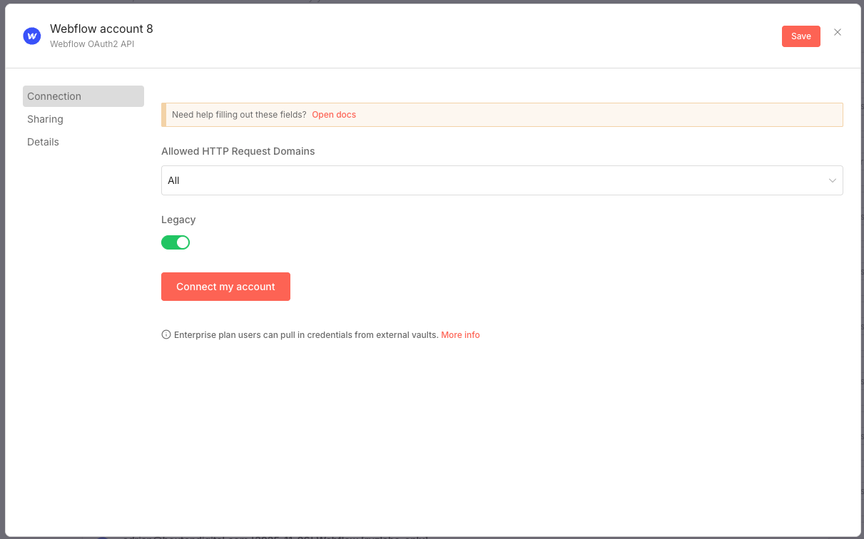 Step 1: I click “Connect my account” in the Webflow OAuth2 API credential settings in n8n