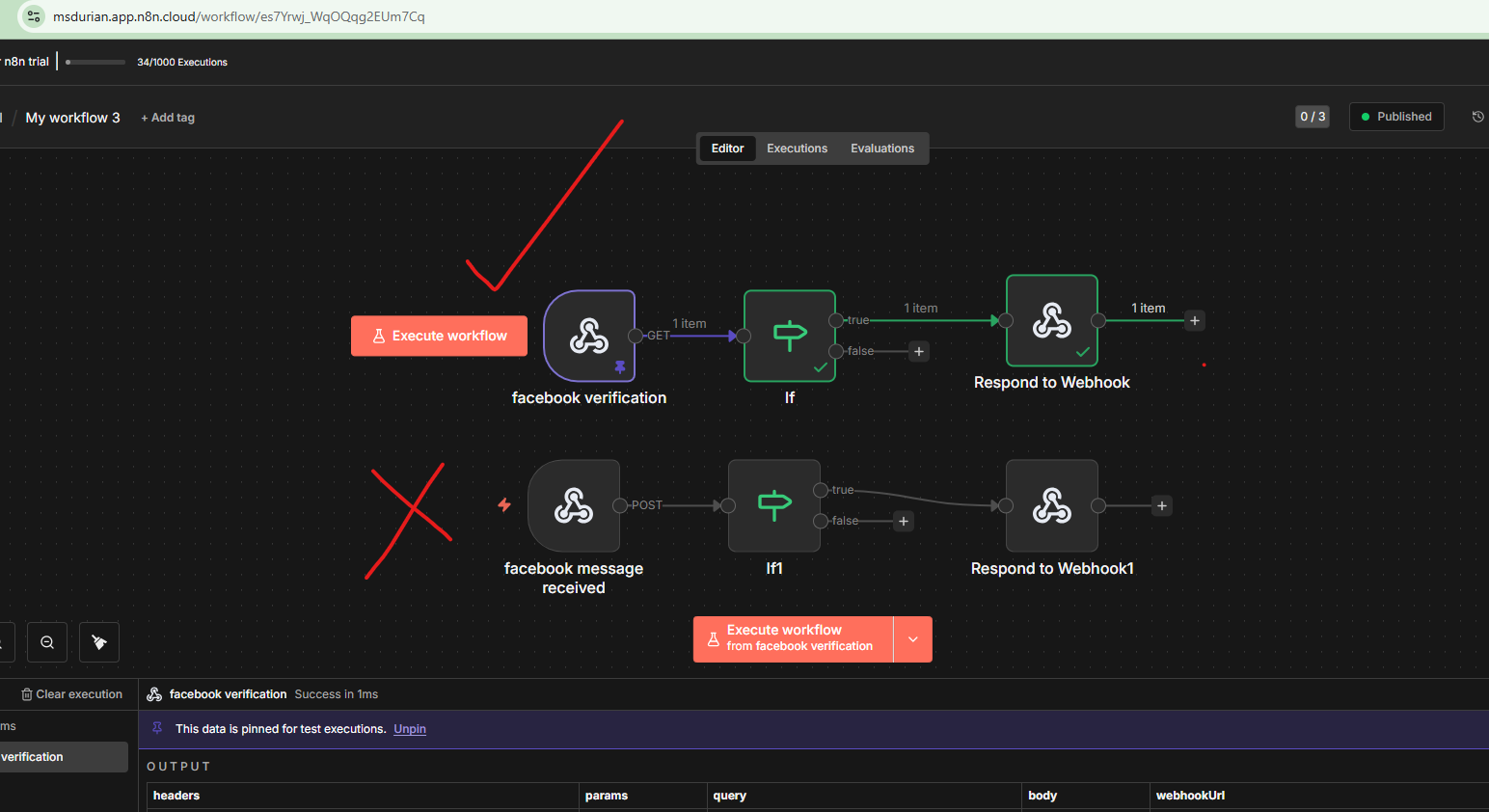 Thanks for the explanation, but from my situation, i have done 2 webhooks(get and post with same path) and 2 Respond to Webhook node, the first one which Webhook get can reach to Meta and done the verification. Then next i tried to reach the Webhook post by sending the message to the page account, it keep loading until timeout. i have check with other tutorial but dont see the problem yet. You can check from my json above. Thanks again for helping newbie(me) .