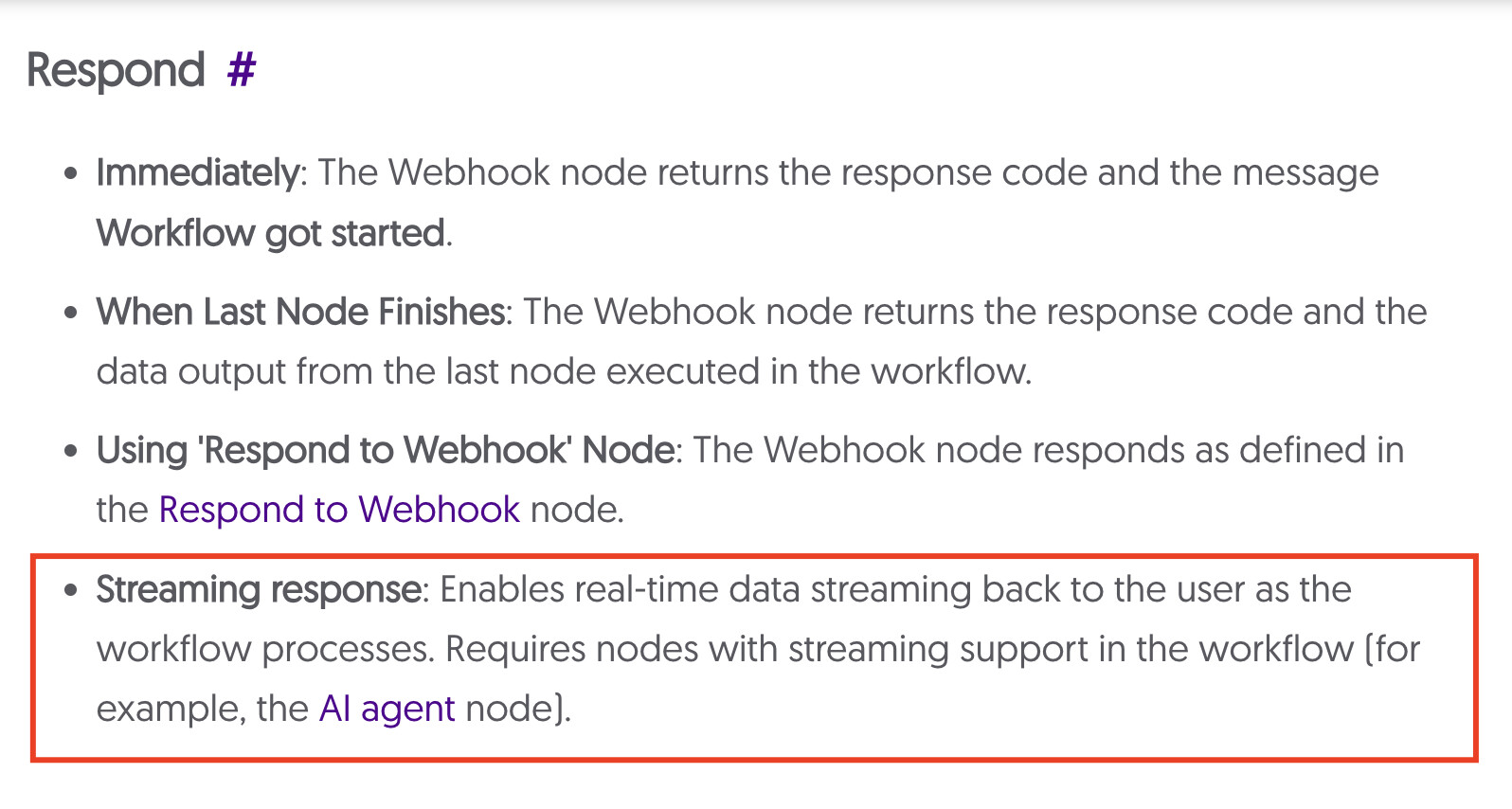 In the Webhook node configuration, I set the “Response Mode” to “Stream”.
