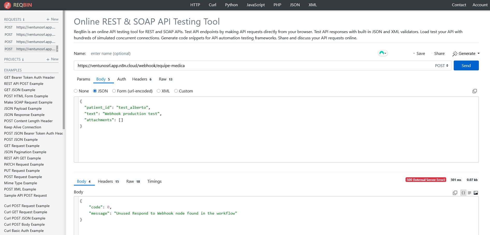 I know exactly what the webhook expects (patient_id, text, attachments), so I’ll send a manual POST request using cURL / Postman (or ReqBin) to the production URL and check if any response is returned.