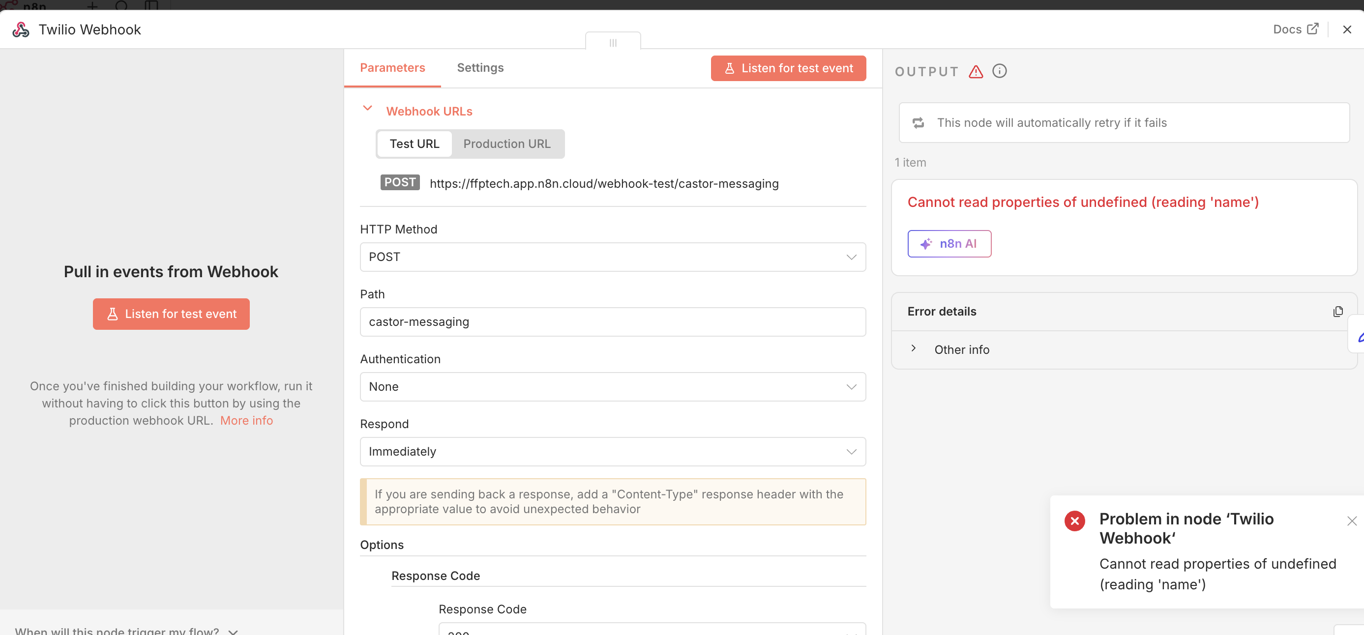 When Twilio sends a POST request to the test webhook, it returns HTTP 500.