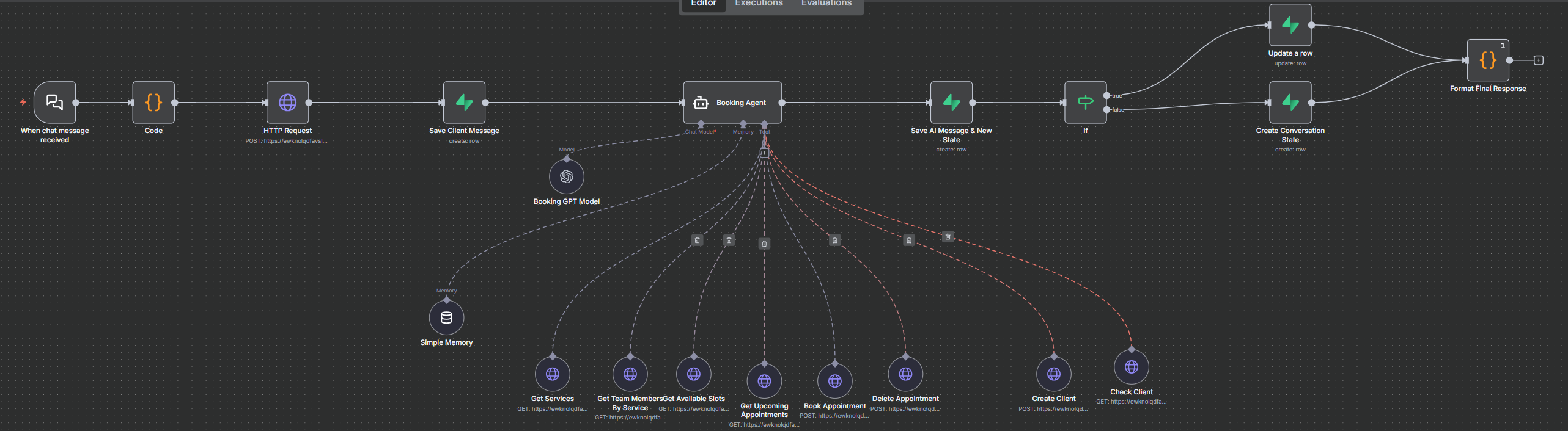 Weâre building an AI-powered booking assistant in n8n that connects to Supabase Edge Functions for all business logic - like reading and writing to a booking calendar system (similar to what a nail studio would use).