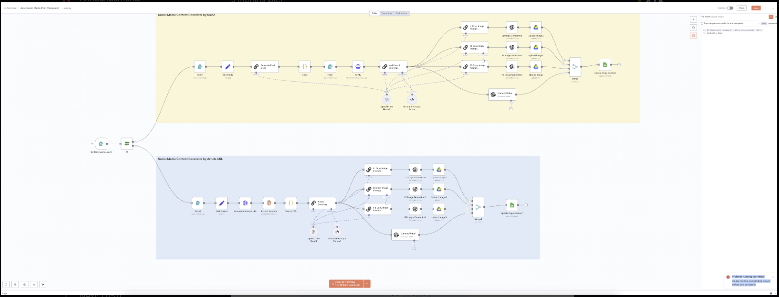 I am having the same issue and not seeing any icons or error tryangles beside the workflow ⌠i am new to this n8n and dont have a great understanding but would like further help in this as i am trying to utilize the Auto Social Media Posts AI Agent and i have everything connectedâŚ