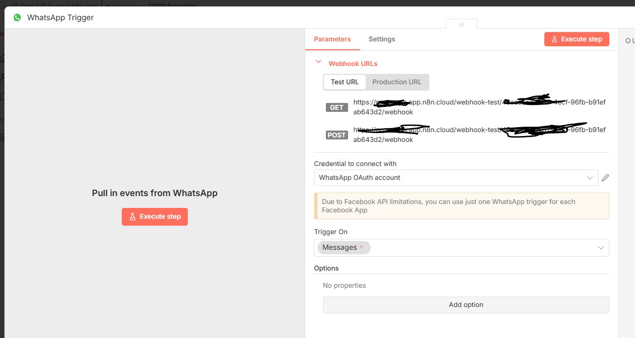 The WhatsApp Trigger node in n8n shows you the webhook URL - copy it exactly as shown. You don’t choose GET/POST - Meta uses GET for verification and POST for actual messages automatically.