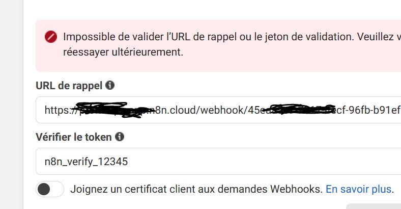 Solution: The Verify Token in Meta doesn’t match the one in n8n. They must be identical.