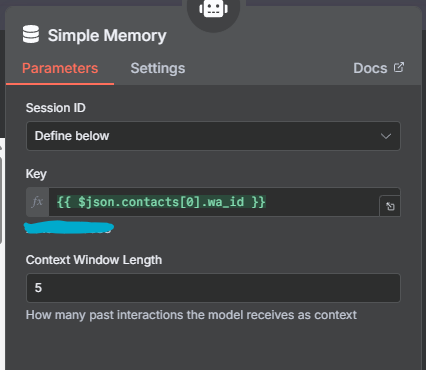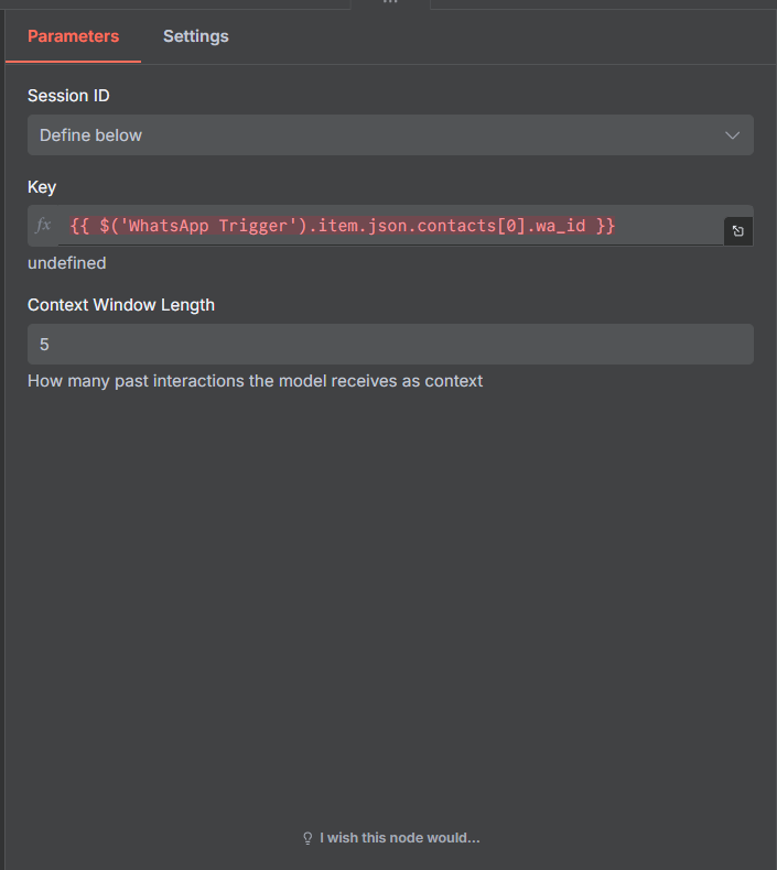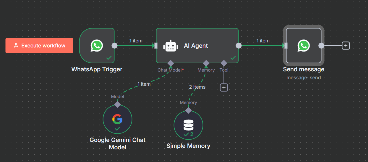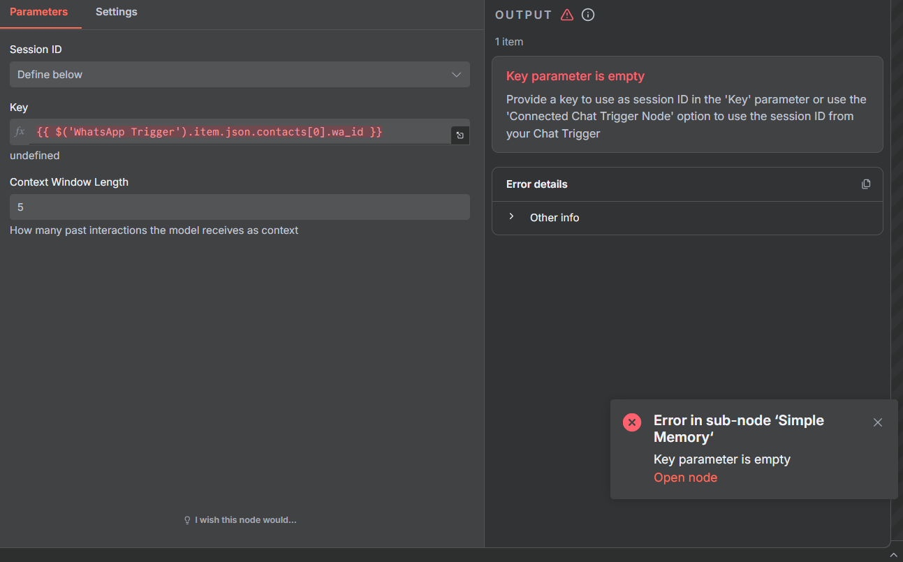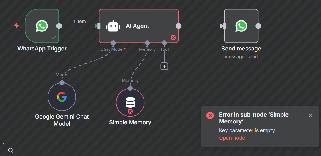 Workflow executes successfully, and then the memory node and the WhatsApp send message node give an error.