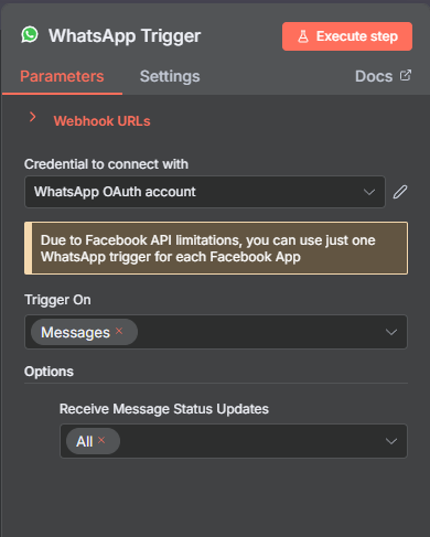And this is how the WhatsApp send message node looks: