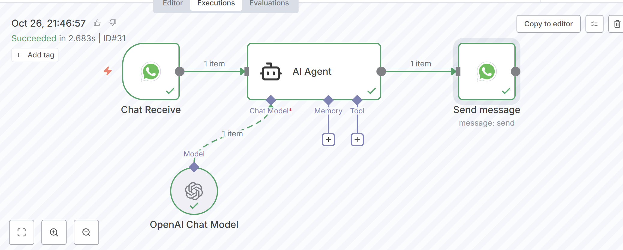 The flow executes successfully and I can see “Success” in the executions and the WhatsApp “Send Message” node returns a successful response (status 200). However, the message never appears in my WhatsApp chat.