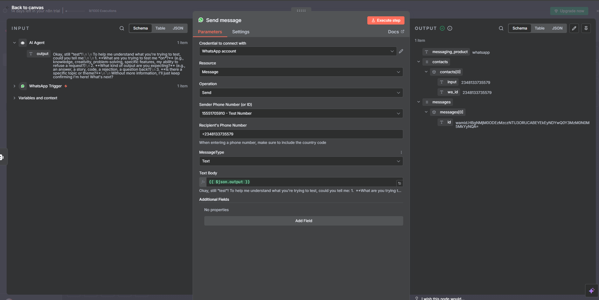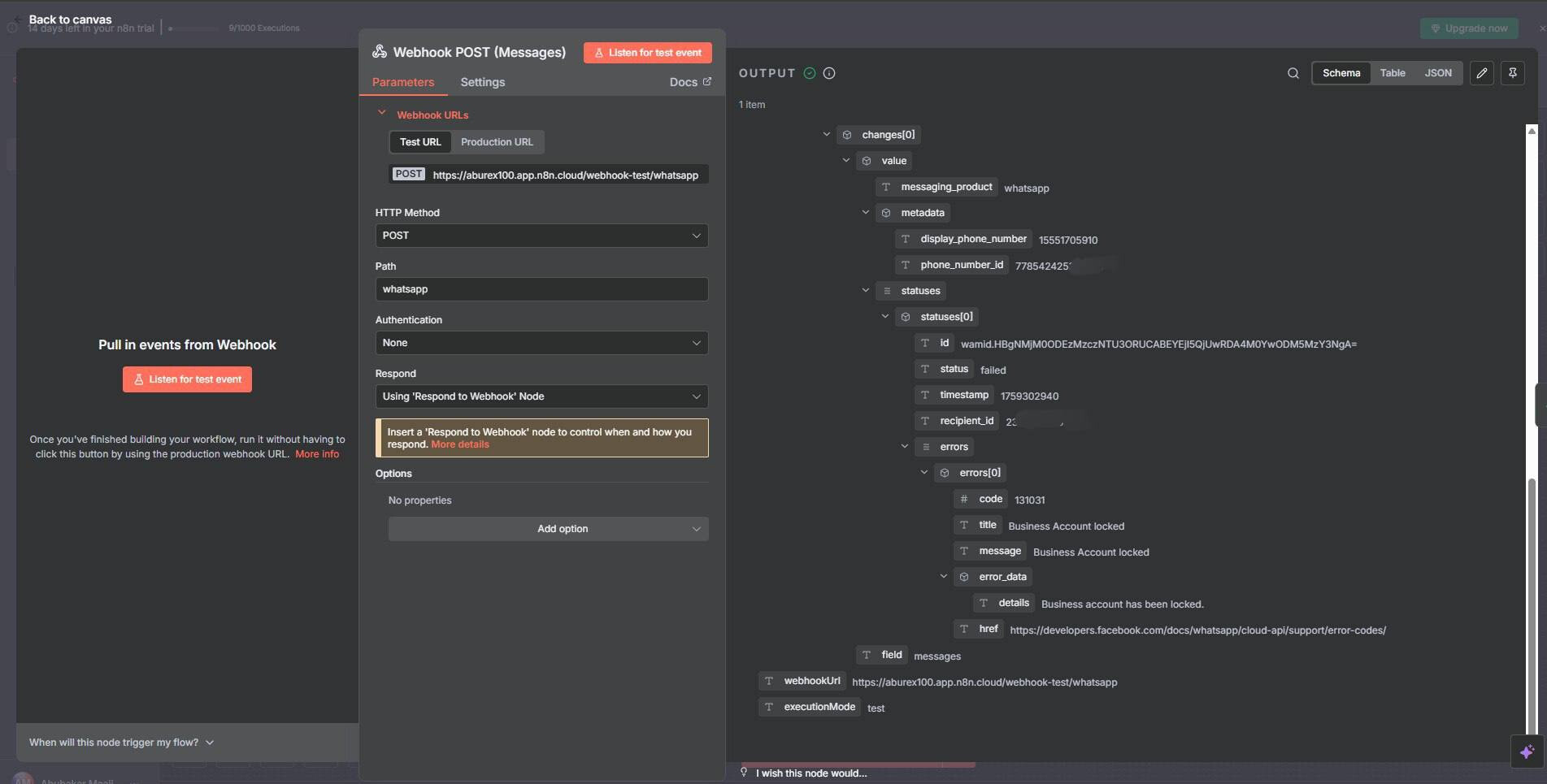 So, I did some digging with Claude AI to find out what exactly the problem was, and I set up a webhook for my WhatsApp API, but after setting up and testing the webhook, I got this response