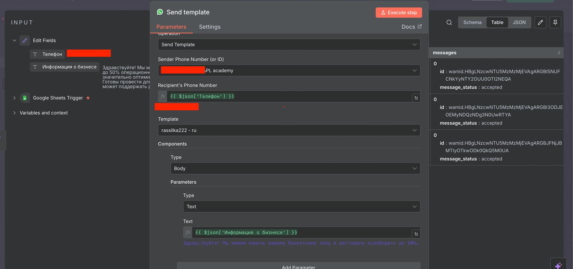 Hello everyone, I have a problem. I have a database of my clients in Google Sheets, and I use Edit Fields to retrieve the numbers and text that need to be sent via WhatsApp. I created a WhatsApp account for sending messages, but I have never written to these clients, and they have never written to me. I created a template with a variable where I add text, and they accepted it. I’m trying to send a message, but it’s not working. However, if I contact them myself within 24 hours, the message will be sent. Please help me solve this problem.