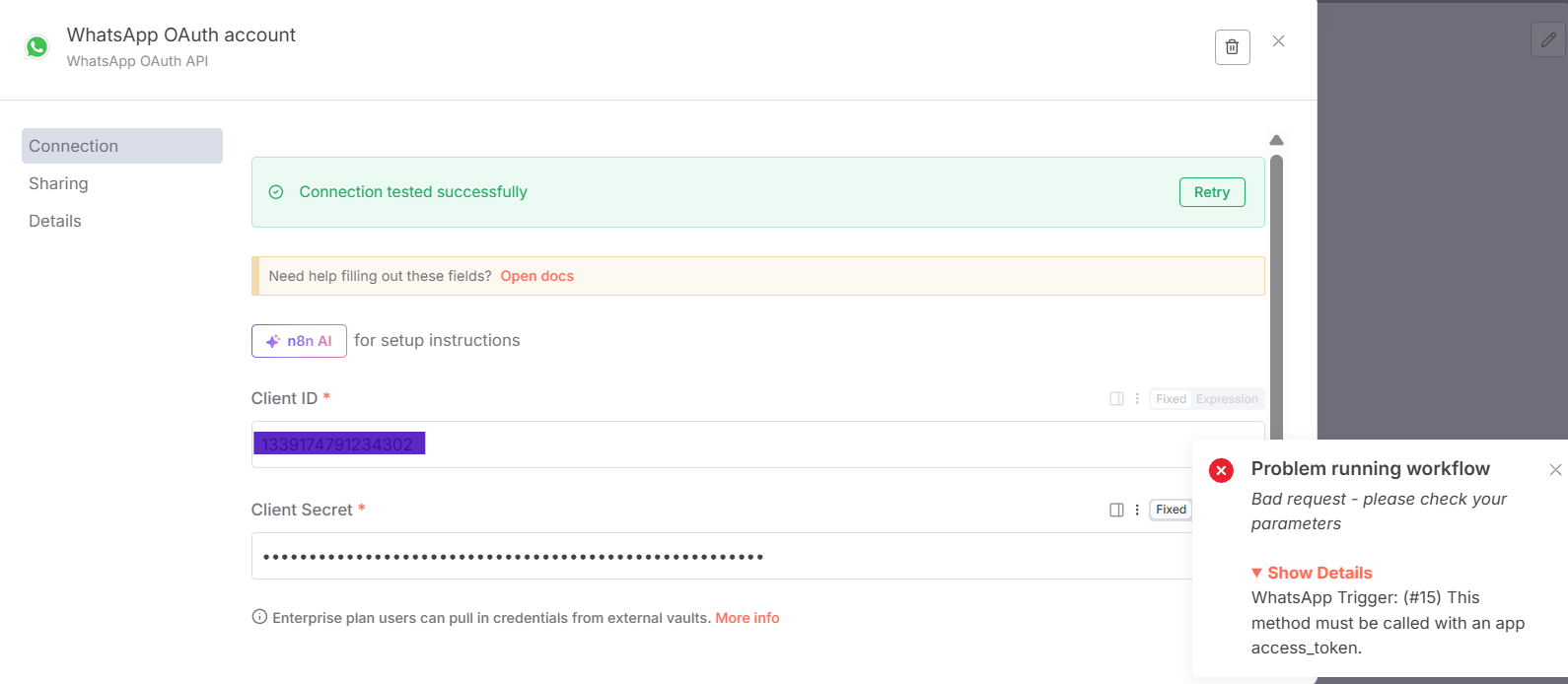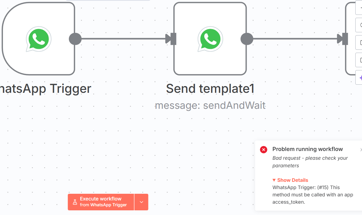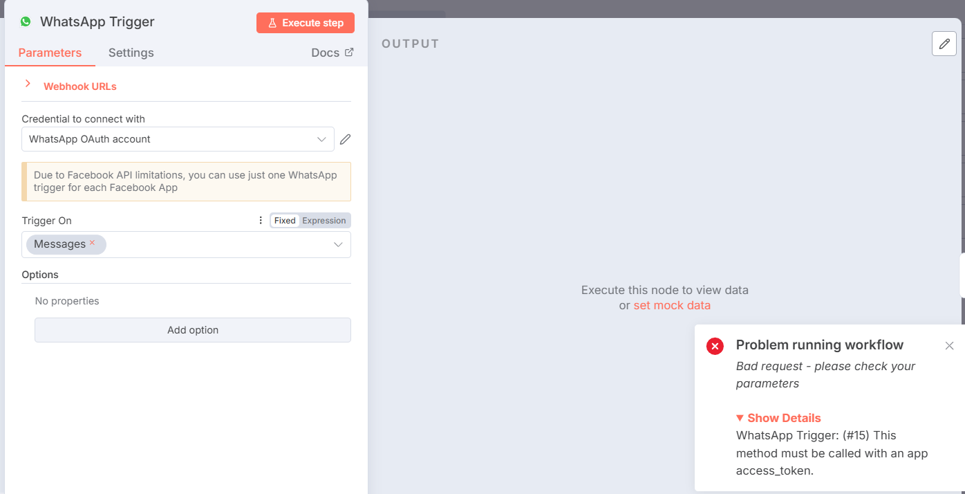As you can see in screenshot, I have setup two different setup as required. In WhatsApp trigger node, when I try to execute it says access token required which is wrong.
