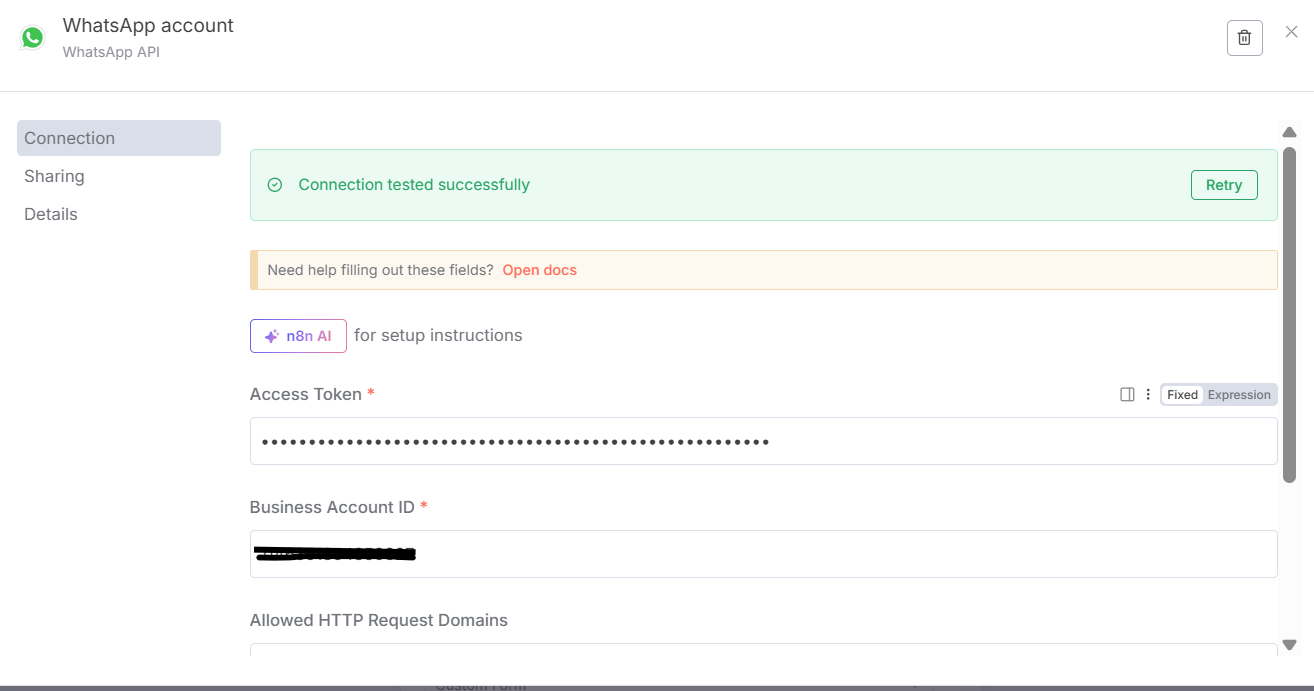 The WhatsApp Business Cloud node (used for sending messages, including templates) requires an API Access Token and Business Account ID. You generate this access token in the Meta Developer Portal.