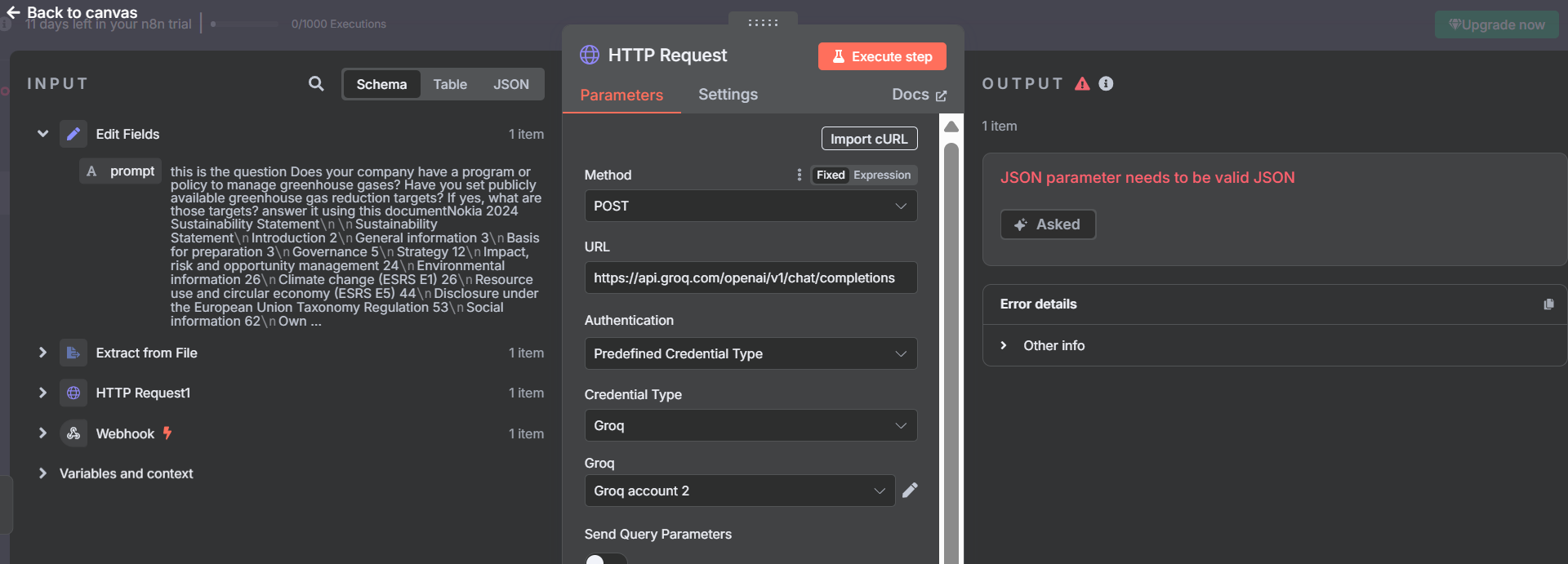 this is my workflow i am having problem in this node https, where i am asking groq llm to answer a query which i am sending through webhook by searching in the document which i have extracted,