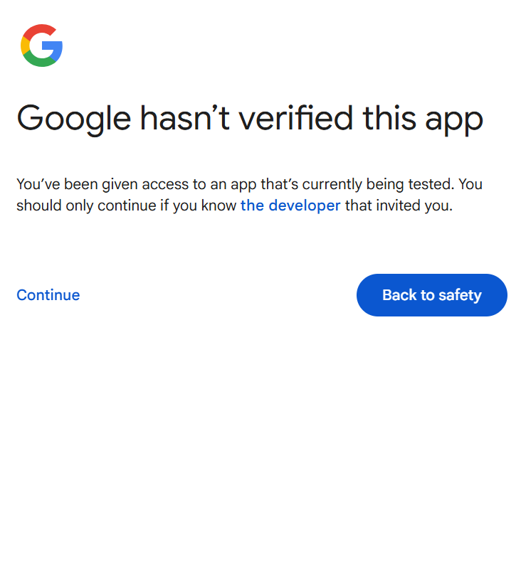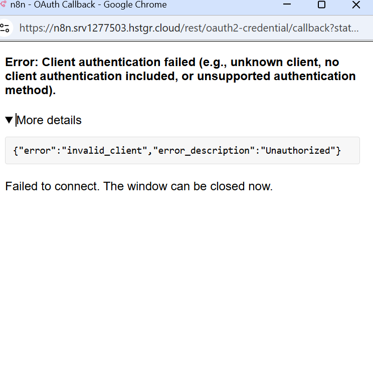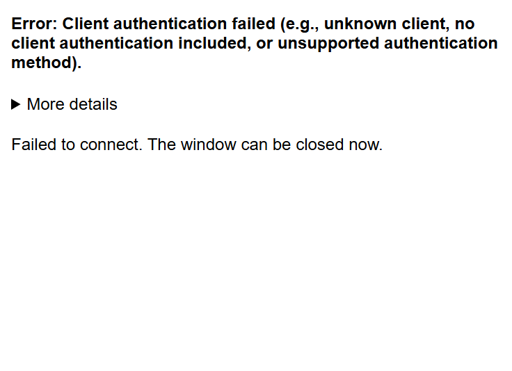 I also get the following screen.Then I owuld check the OAuth again under clients https://console.cloud.google.com/auth/clients to see if the application type is “web application” and double check the ID and secret and URI or rebuild the credentials with new ones from there, as the error states client authentication