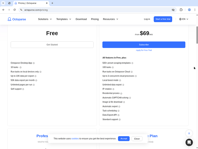 Hi all! I learn different scrapers and I want to find the optimal for myself. I used Apify for a mounth but it seemed expensive to me. I tried FireCrawl, but it does not allow to parse the acounts of social media. The Bright Data seemed cool, but the price of 1.50$ per 1000 records is a lot, given that I have 10 acounts of 500-1000 videos each and I want to update them once a day only for likes, comments, views, number of posts. Found www.octoparse.com and I want to ask a question-is it enough for a monthly subscription for my task or will it be necessary to as Pay-as-you-go + monthly subscription for that?