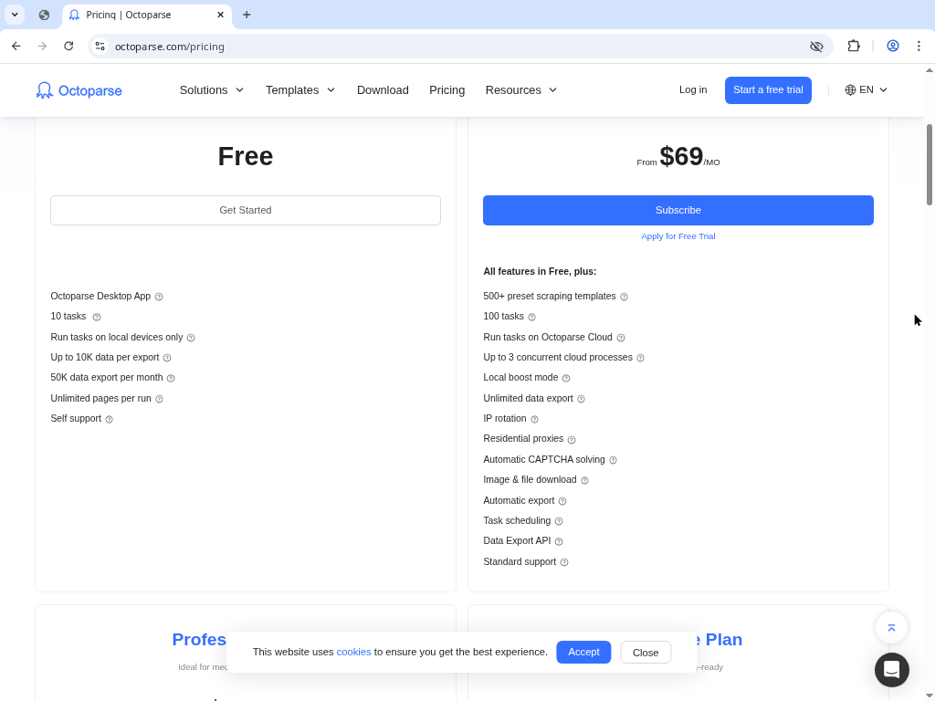 Octoparse sells its own plans – it isn’t “pay per account” in the way some proxy providers are. Their Standard plan (around US$69/month at the time of writing) includes 100 tasks that can run in the Octoparse cloud with up to three concurrent processes, unlimited data export and built‑in IP rotation, residential proxies and CAPTCHA‑solving