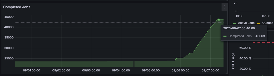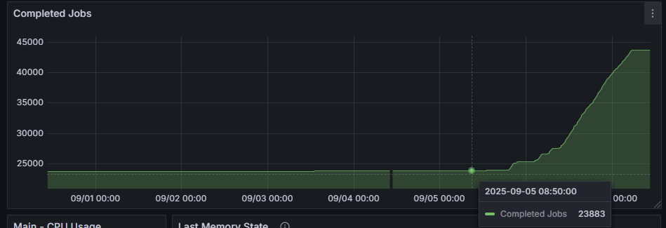 I am using n8n main node metrics to track what is going on, and here is my prometheus query for visualization. (n8n_scaling_mode_queue_jobs_completed ) I have a single environment right now (production).