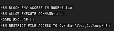 Verified variables were correctly loaded (e.g., Execute Command node works when N8N_ALLOW_EXECUTE_COMMAND=true, confirming env variables are being read)