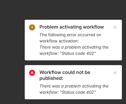 There was a problem activating the workflow: "Status code 402"Describe the problem/error/question