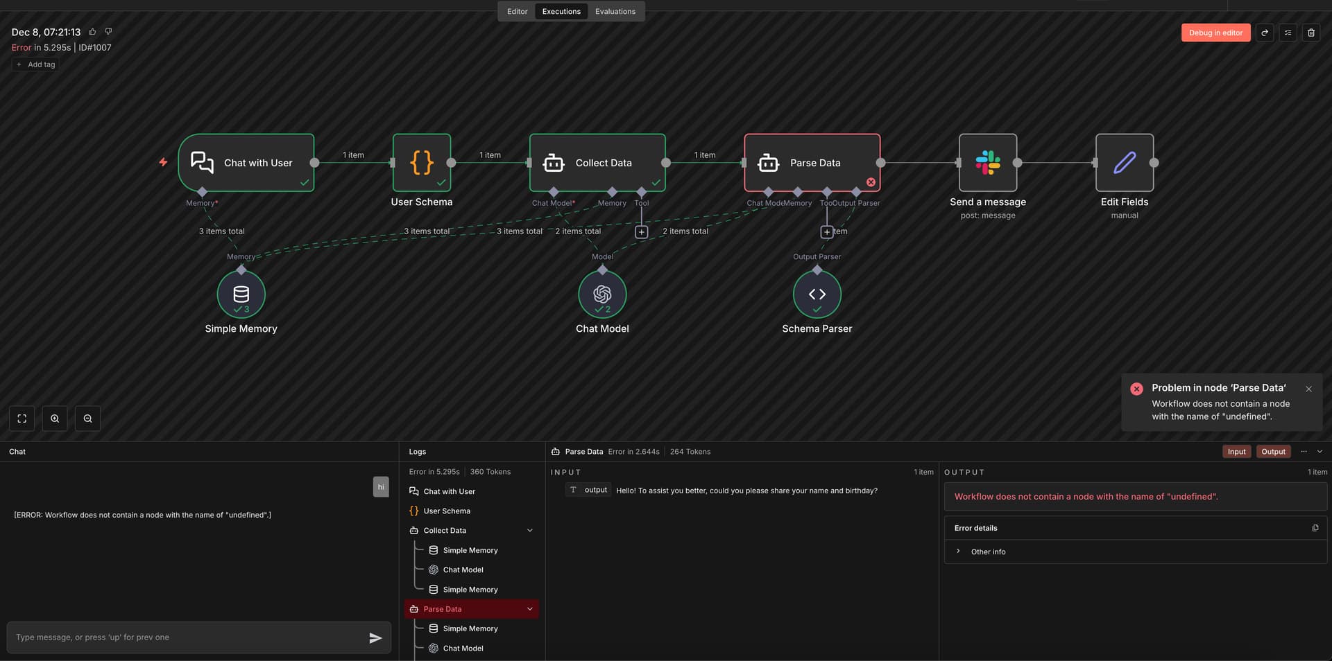 I noticed youβre hitting an error in the Parse Data node when enabling streaming. I believe Iβve encountered this beforeβit seems that when streaming is active, the node loses its reference to the previous User Schema node.