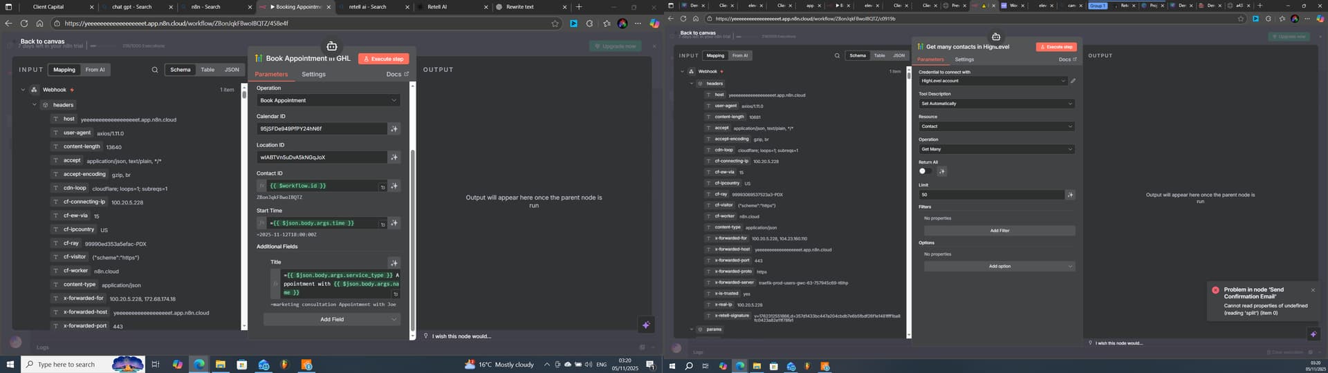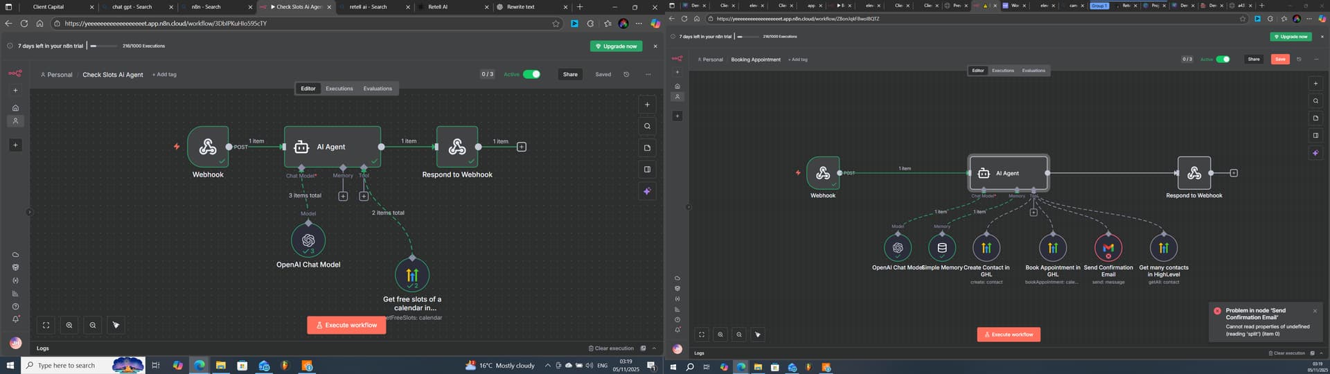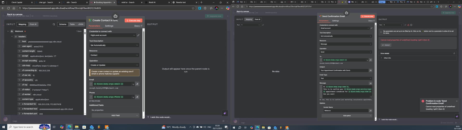 Summary; I’ve built a Voice AI agent using Retell and am nearly finished with the setup. In short, I’ve connected two webhooks, one for checking appointment availability (which works correctly) and another for booking appointments. The overall logic and structure are in place, but when testing the booking URL, the tools responsible for sending, booking, or updating don’t seem to trigger.